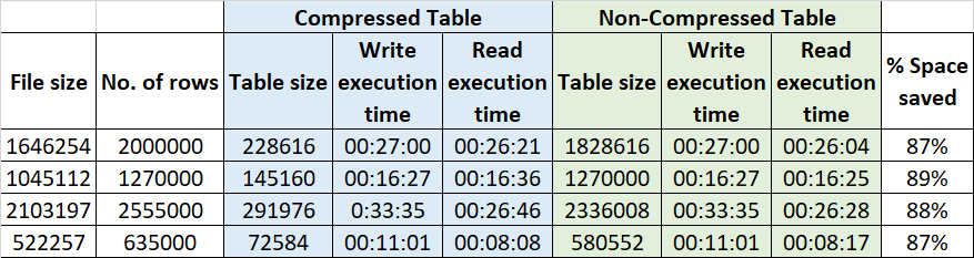 - Read execution time: Slight / negligible difference. The plain SELECT statement was executed for comparing the Read execution time. The Compressed table took 10-20 seconds more, which is approx. <2%. As compared to the disk space saved, this slight overhead was acceptable in our workload. However, you need to review thoroughly your case before taking any decision.