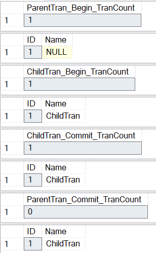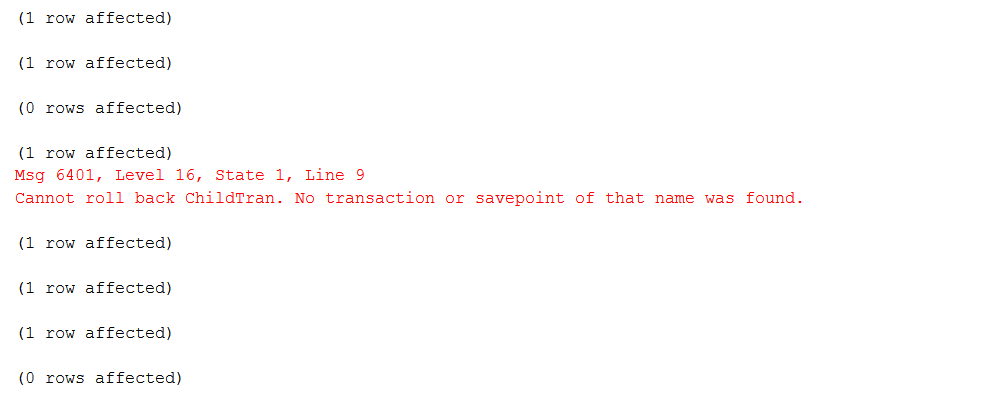 Output of the above query will look like similar to as shown in the image below. If you’ll notice here, the ‘ROLLBACK TRANSACTION ChildTran;’ statement didn’t roll backed anything. Thinking of why?